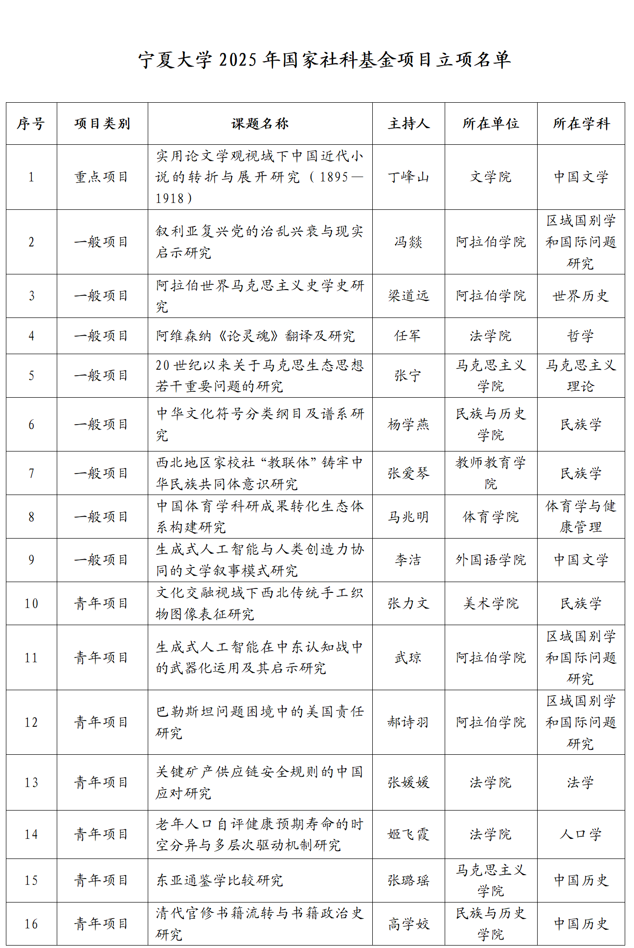 近日,2025年国家社科基金教育学、艺术学和年度项目立项结果先后正式公布,我校共有28个项目获得立项资助(其中重点项目1项、一般项目8项、青年项目8项、西部项目11项),立项数创“十四五”期间我校国家社科基金项目立项最好成绩。2025年度我校国家社科基金立项数在全区位居第1名(约占全区立项总数的55%),在Z14高校中位居第4名,在全国高校中位居第51名。目前,仍有部分国家社科基金项目(如冷门绝学研究专项、高校思想政治理论课研究专项、后期资助项目等)正在组织申报或评审中。