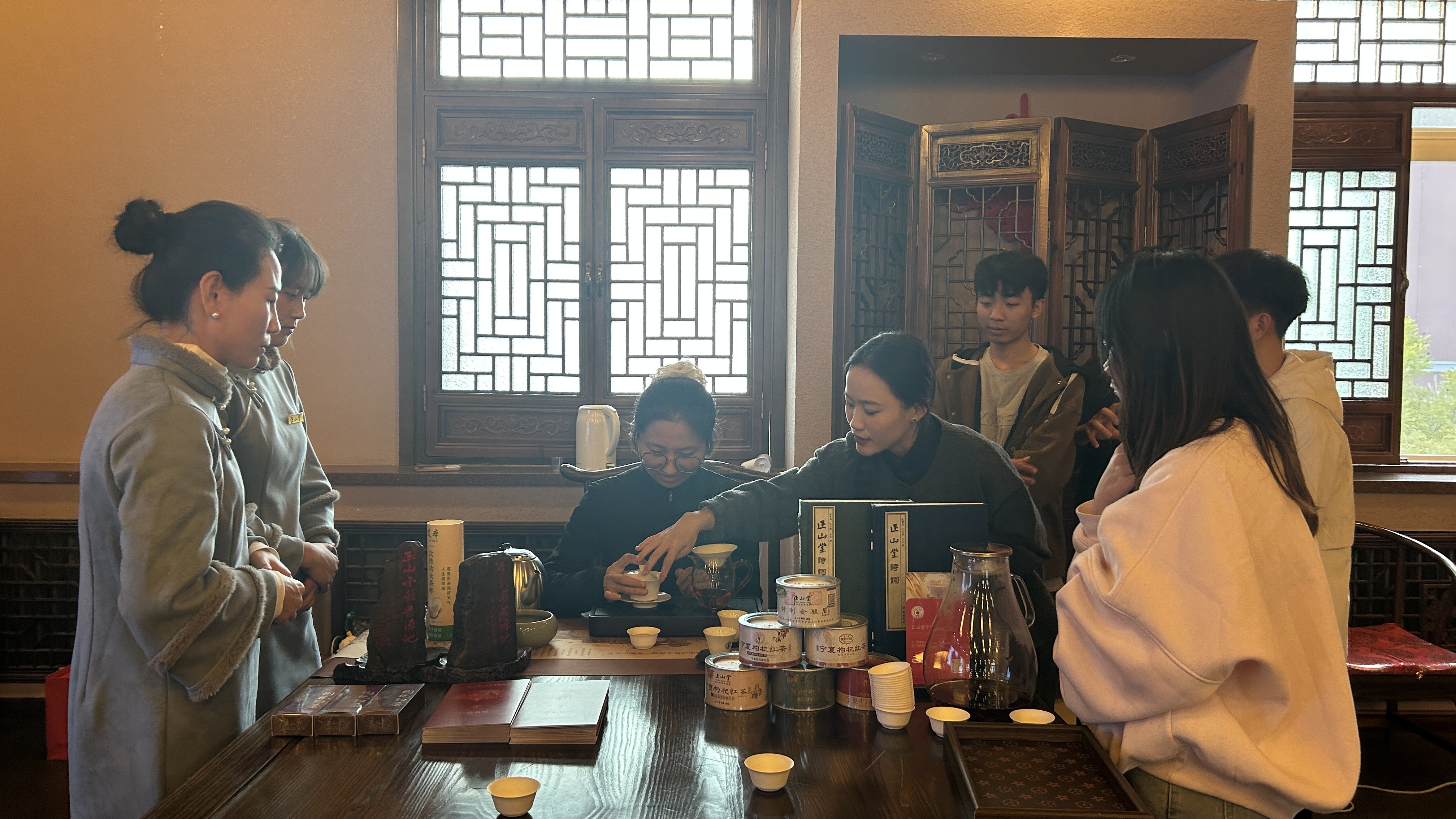随后,培训师深入讲解了红茶的特点、制作工艺与健康功效。现场不仅展示了优质红茶的干茶形态,更细致传授了“观形、闻香”的品鉴要诀,让同学们对红茶有了更为直观和深刻的认识。在核心环节“枸杞红茶的创新与魅力”中,主讲人重点阐述了宁夏枸杞与优质红茶跨界融合的创举,从独特口感、双重养生价值到背后所承载的闽宁两地文化故事,全方位展现了这一创新产品的独特魅力。